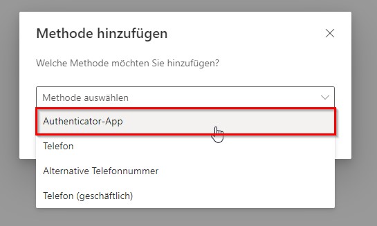 4. Als nächstes wählen Sie im Dropdown Menü die Methode „Authenticator-App“ aus und klicken dann auf „hinzufügen“